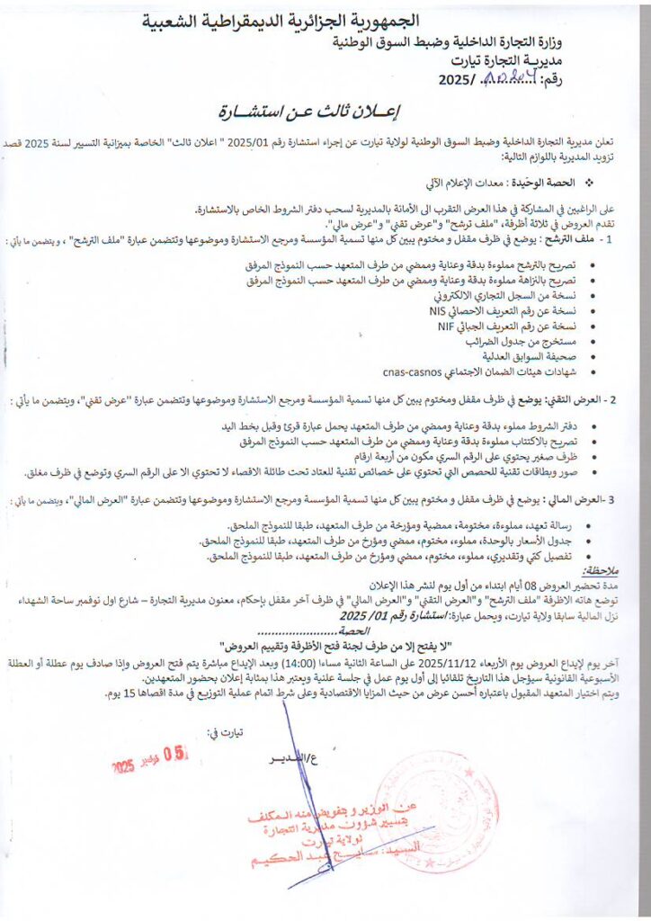 تعلن مديرية التجارة لولاية تيارت عن إجراء استشارة رقم 01/2025 الخاصة بميزانية التسيير لسنة 2025 قصد تزويد المديرية باللوازم المذكورة في الإعلان