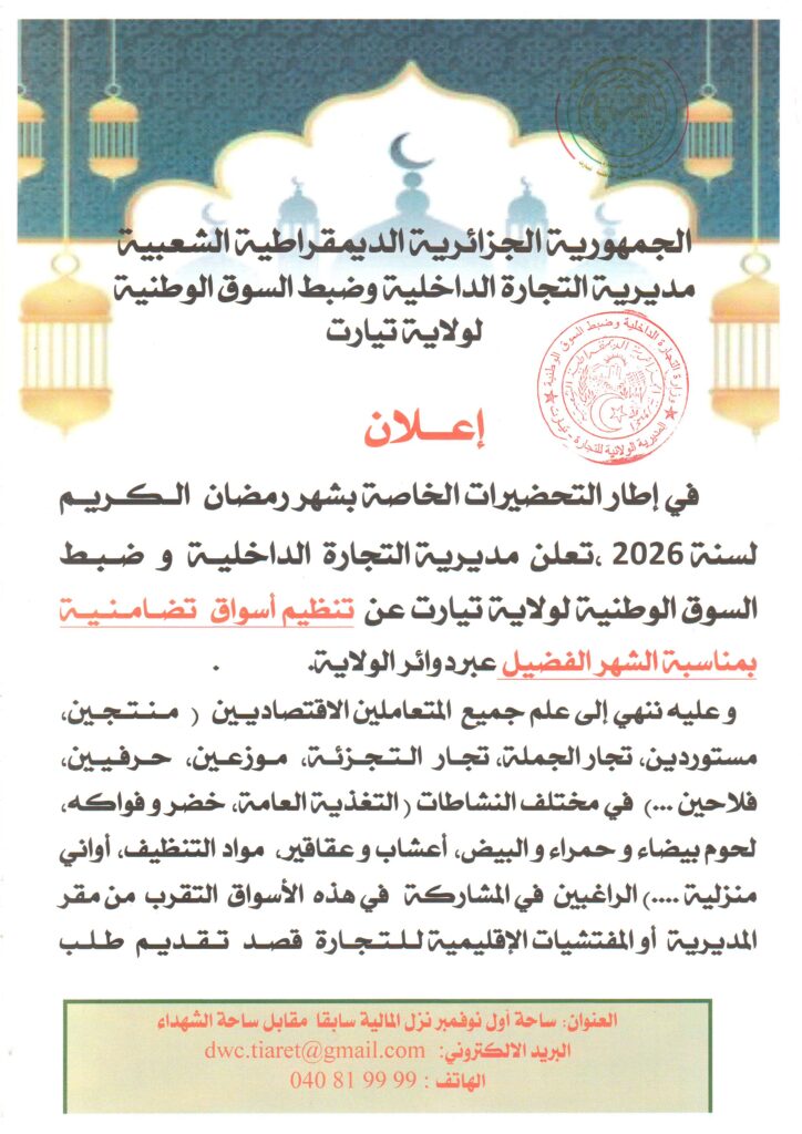 مواقع قطاع التجارة وزارة التجارة النسخة العربية : http://www.commerce.gov.dz/ar النسخة الفرنسية : http://www.commerce.gov.dz لمديرية الجهوية للتجارة بشار (رمز الولاية: 08) : 06 مواقع المديرية الجهوية للتجارة بشار www.drc-bechar.dz مديرية التجارة لولاية بشار www.dcwbechar.dz مديرية التجارة لولاية النعامة www.dcw-naama.dz مديرية التجارة لولاية أدرار www.dcwadrar.dz مديرية التجارة لولاية تندوف www.dcwtindouf.dz مديرية التجارة لولاية البيض www.dcwelbayadh.dz المديرية الجهوية للتجارة ورقلة (رمز…